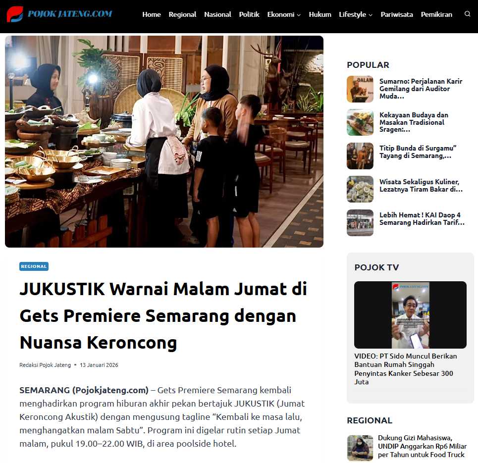 SEMARANG (Pojokjateng.com) – Gets Premiere Semarang kembali menghadirkan program hiburan akhir pekan bertajuk JUKUSTIK (Jumat Keroncong Akustik) dengan mengusung tagline “Kembali ke masa lalu, menghangatkan malam Sabtu”. Program ini digelar rutin setiap Jumat malam, pukul 19.00–22.00 WIB, di area poolside hotel.